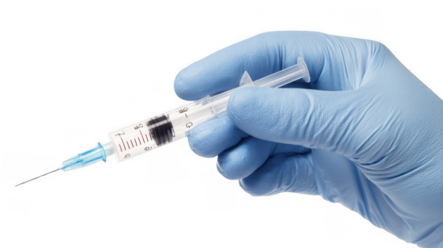 Doctor wearing blue surgical gloves is holding a syringe filled with blue liquid, positioned against a transparent background, ready for administering a medical injection