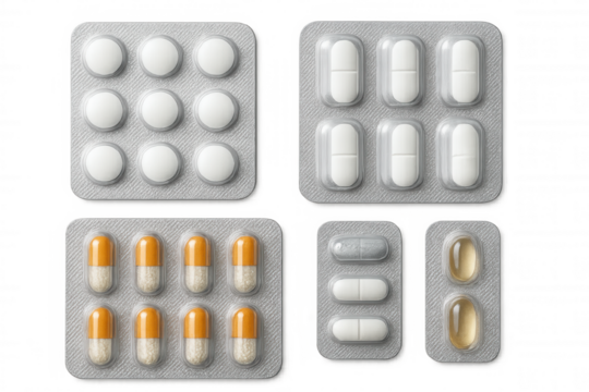 Group of blister packs of prescription medication, antibiotic pills, painkillers, isolated on a transparent background. Healthcare and medical treatment concept