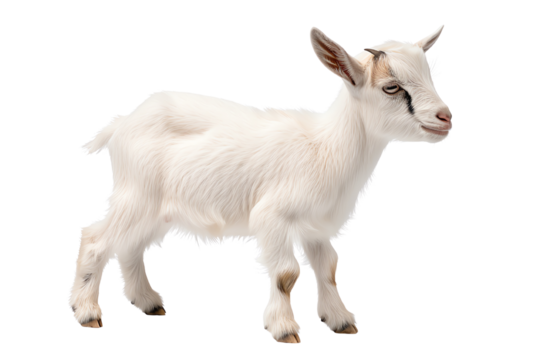 A charming white goat standing playfully, showcasing its adorable features and lively spirit in a natural setting.