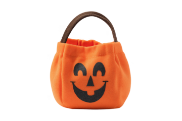 Orange fabric pumpkin trick or treat bag with black face isolated on a transparent background Halloween