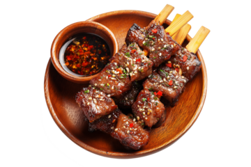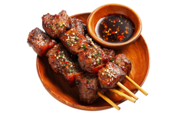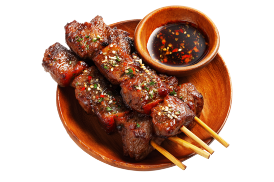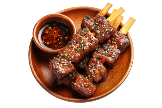 Anticuchos grilled beef meat skewer with sesame seeds and herbs in wooden bowl isolated on white transparent background, concept of South American barbecue cuisine.