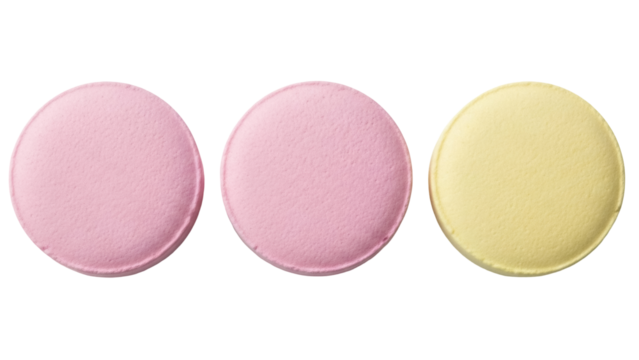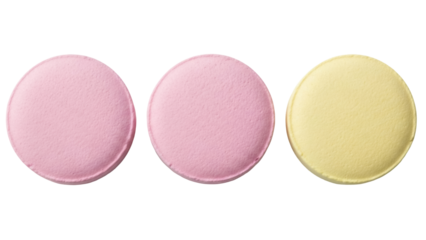 Three round pills isolated on transparent background, pink and yellow tablets for medication and healthcare use PNG