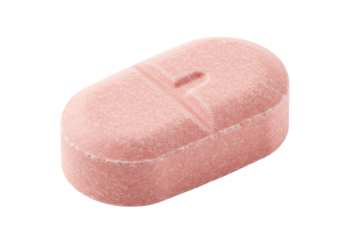 Isolated oblong pink pill with indentation for splitting, medicine tablet for treatment