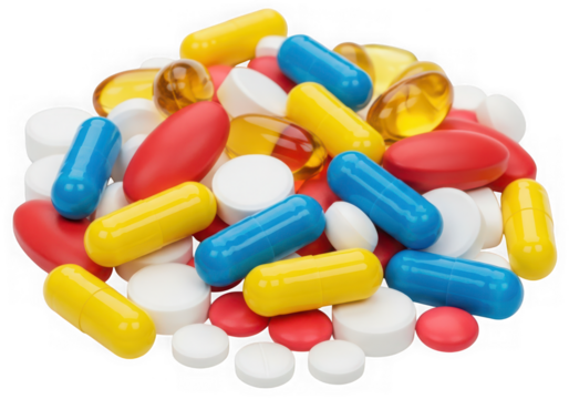 A pile of colorful pharmaceutical pills and capsules, including red, blue, and yellow capsules, white tablets, and yellow gel capsules, isolated on transparent background