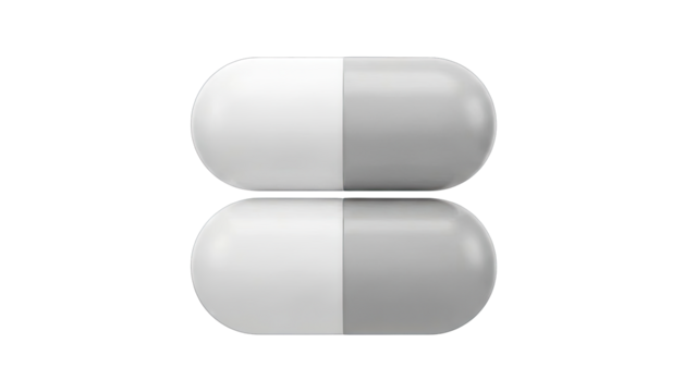 Two white capsules in blister packaging along with two loose tablets on a transparent background