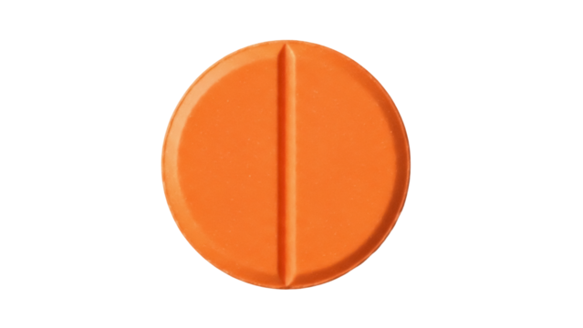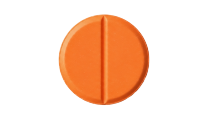 Orange round pill with score isolated PNG, medication tablet for health and pharmaceutical use on transparent background