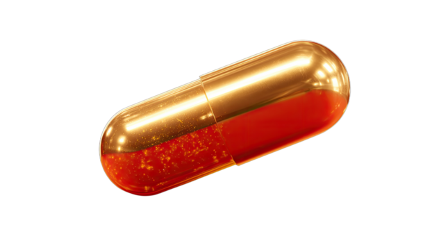 A single, elongated capsule with a shiny gold top and a transparent red bottom