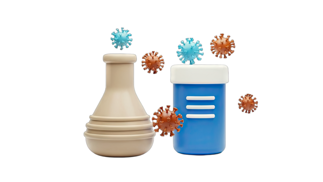 Virus Treatment: Flask and Medicine Bottle with Coronavirus Particles