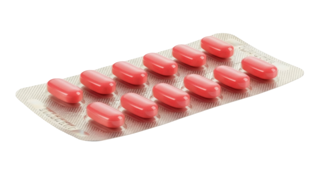 Isolated medicine blister pack of pink pills remedy for healthcare supplement, blistered drug