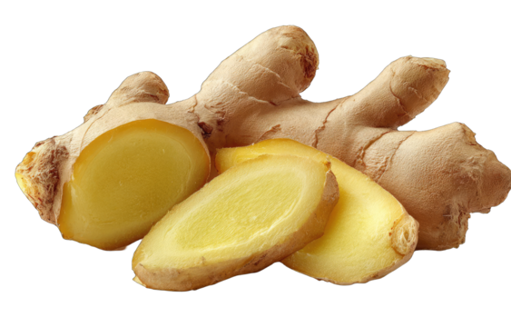 Fresh ginger root and sliced rhizome, culinary spice and healthy ingredient, on transparent background