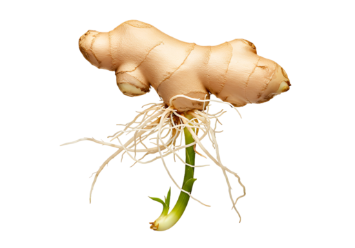 Fresh ginger root sprouting with vibrant green shoot and delicate roots, offering natural wellness and culinary inspiration for healthy recipes