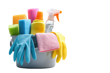 Spring cleaning, tulips and household chemicals isolated on a white background, top view, PNG