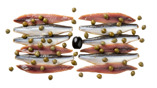 Delicious Mediterranean appetizer of anchovy fillets with capers and olive isolated on transparent background