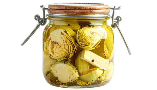 Artichoke halves pickled inside clear, hinged jar