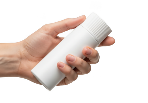 Hand holding white deodorant stick, antiperspirant container, personal care product, beauty, hygiene, body, isolated on transparent background