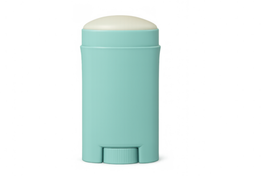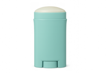 Turquoise deodorant stick partially uncapped, resting on transparent surface, showcasing sleek minimalist packaging with clean aesthetic