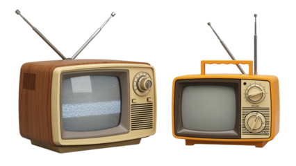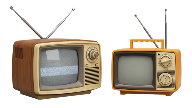 Two retro television sets, one brown and wood-grain, the other orange, both with antennas, knobs, and grayscale screens