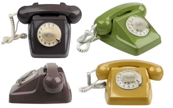 Photo of an old vintage blue rotary dial phone with receiver and a spiral cord isolated on white or transparent background, png file