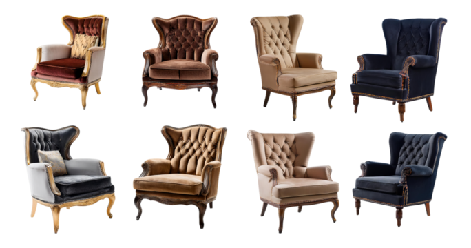 Set of decorative luxury designer armchairs isolated on white background