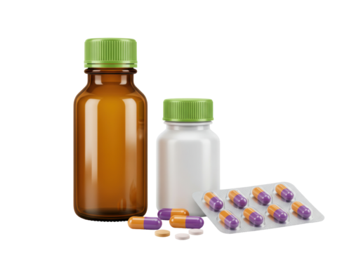 Isolated still life showing medicines and pills and bottles against neutral background