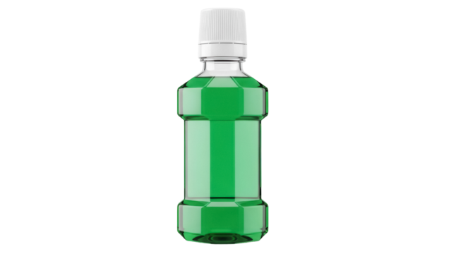 Green mouthwash bottle isolated PNG on transparent background, antiseptic liquid for oral hygiene and dental care, fresh breath