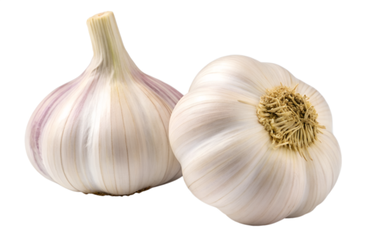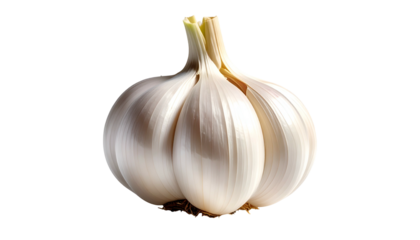 A whole garlic bulb and three peeled cloves are placed separately on a white background; it is widely used in traditional cuisine and medicine due to its distinctive flavor.