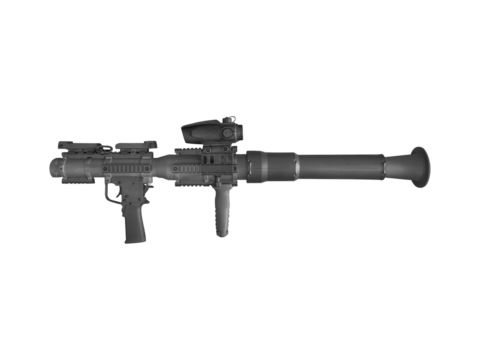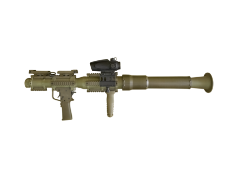 Modern sand colored rocket-propelled grenade launcher is isolated on transparent background.