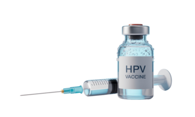 Close Up Of Vaccine Vial And Syringe With HPV Vaccine Label On Transparent Background