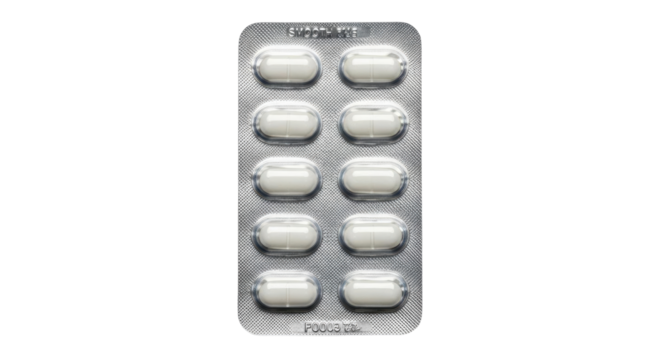 Colorful pills and capsules arranged in a blister pack sit on a transparent background, showcasing different types of medication for pharmaceutical or healthcare concepts