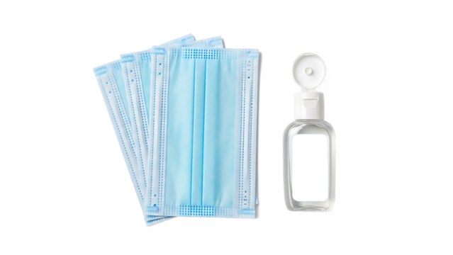 Disposable Face Masks and Hand Sanitizer Isolated on transparent background