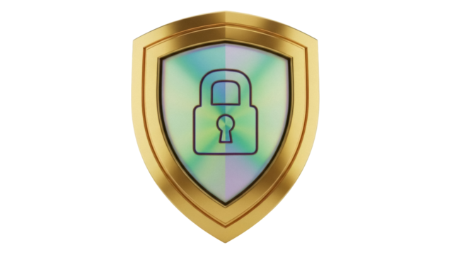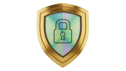Golden shield with padlock isolated PNG, security and protection concept for graphic design and web development