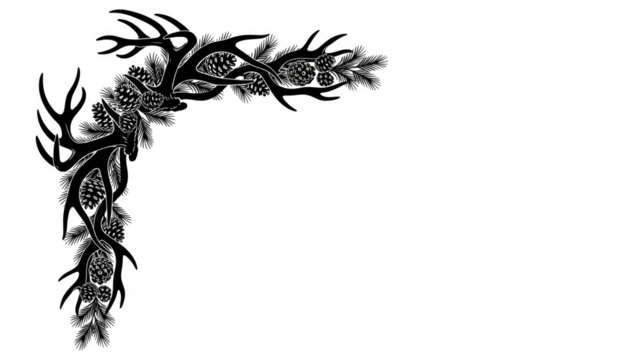 White line art deer antlers pine cones fir branches corner design black background