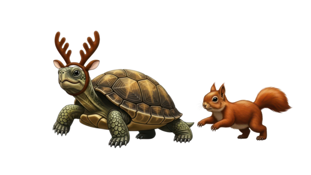 Whimsical illustration of a turtle wearing reindeer antlers and a squirrel following isolated PNG with Transparent Background