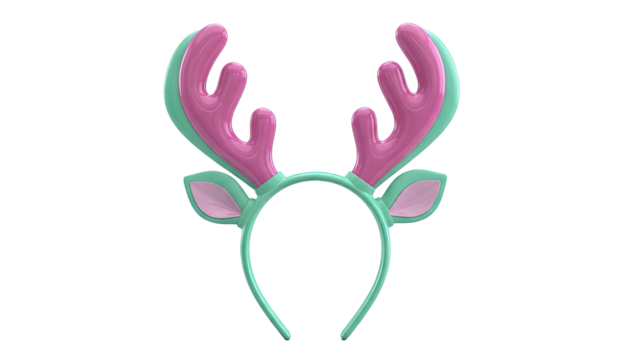 A festive reindeer antler headband featuring soft red antlers, furry brown ears, and green holiday trim on a solid background. background removed