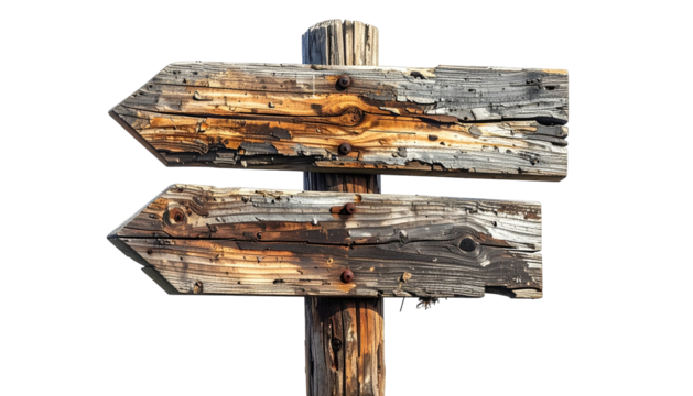 Weathered wooden directional sign with two arrows pointing in opposite directions