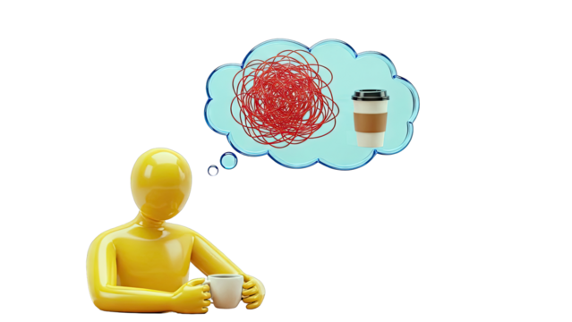 Yellow figure contemplating tangled thoughts with coffee