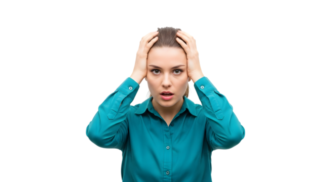 Young female doctor wearing a lab coat experiencing anxiety and panic upon receiving a diagnosis, set against a transparent background. Emotions of worry and fear are evident