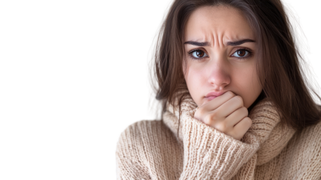 A young woman displaying anxiety and concern, with a worried expression, wearing a cozy sweater. The background is white and isolated.