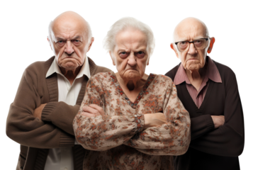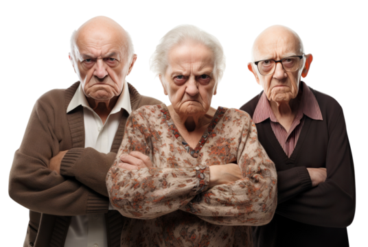 Group of elderly individuals standing with angry faces, showcasing their collective dissatisfaction, cut out