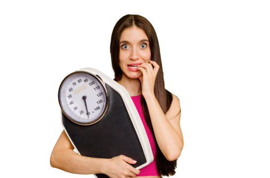 Young caucasian woman holding a scale isolated biting fingernails, nervous and very anxious.