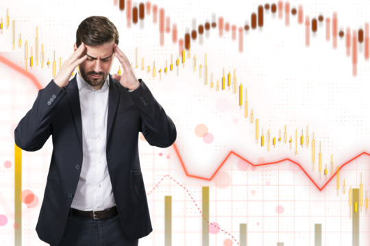 Man in distress with hands on head against a background with stock market graphs, concept of financial stress or crisis