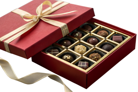 An elegant red gift box filled with an assortment of gourmet chocolates, beautifully arranged and tied with a golden ribbon, perfect for any special occasion