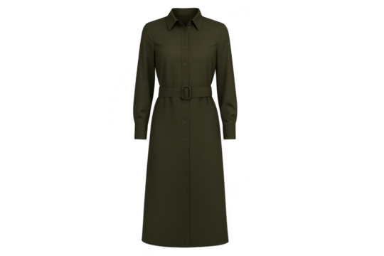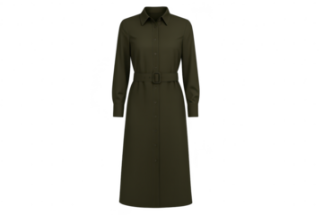 Elegant dark green belted shirt dress isolated on transparent background