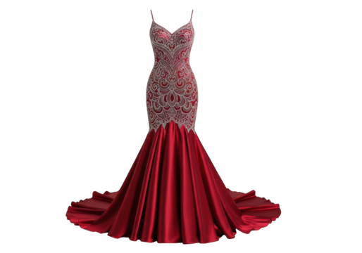 Elegant red mermaid gown with intricate beading isolated on transparent background