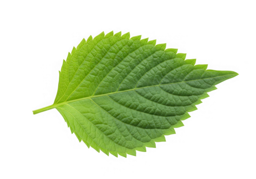 Vibrant green serrated leaf isolated on transparent background. Vibrant green perilla leaf with serrated edges isolated on white background.