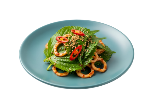A vibrant salad featuring tender squid rings, fresh perilla leaves, and a spicy glaze, arranged attractively on a teal plate.