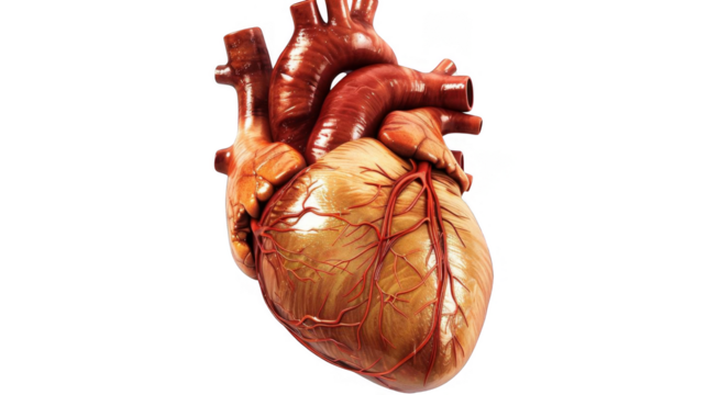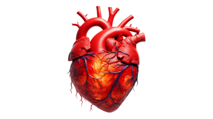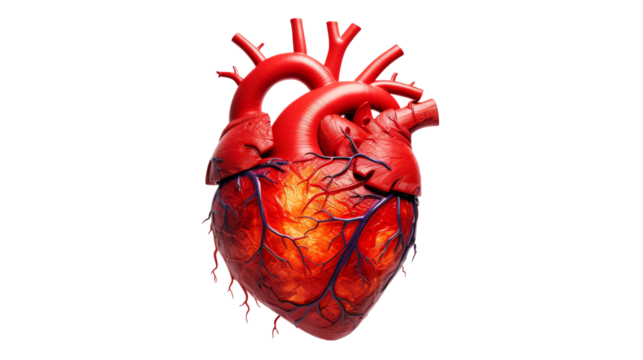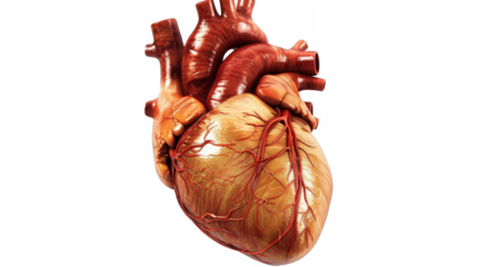 Anatomical model of a human heart isolated on transparent background showcasing the organs structure, including the atria, ventricles, and major blood vessels in detail