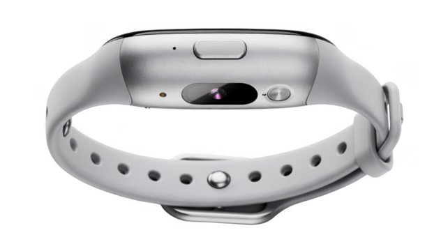 Closeup of a sleek smart wristband with integrated blood pressure sensor designed for continuous cuffless monitoring of hypertension and aortic health on a white background.