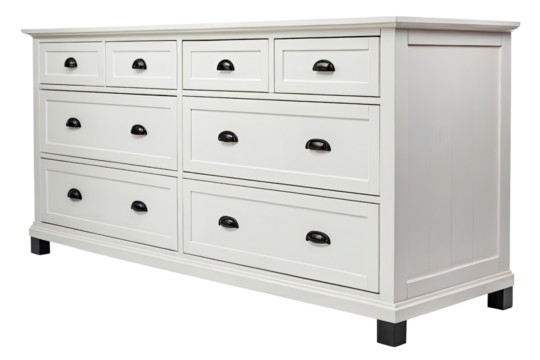 White dresser with black cup handles and black legs isolated on transparent background