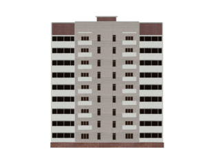 Urban Apartment Building Facade with Balconies, street level view, isolated on a transparent background.